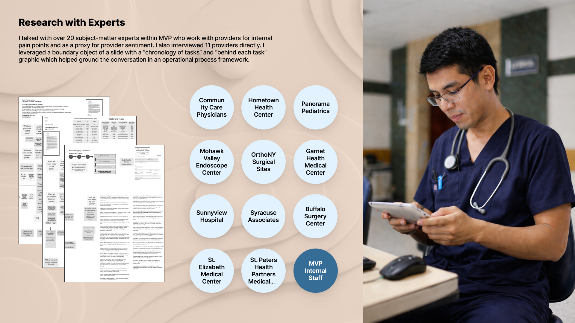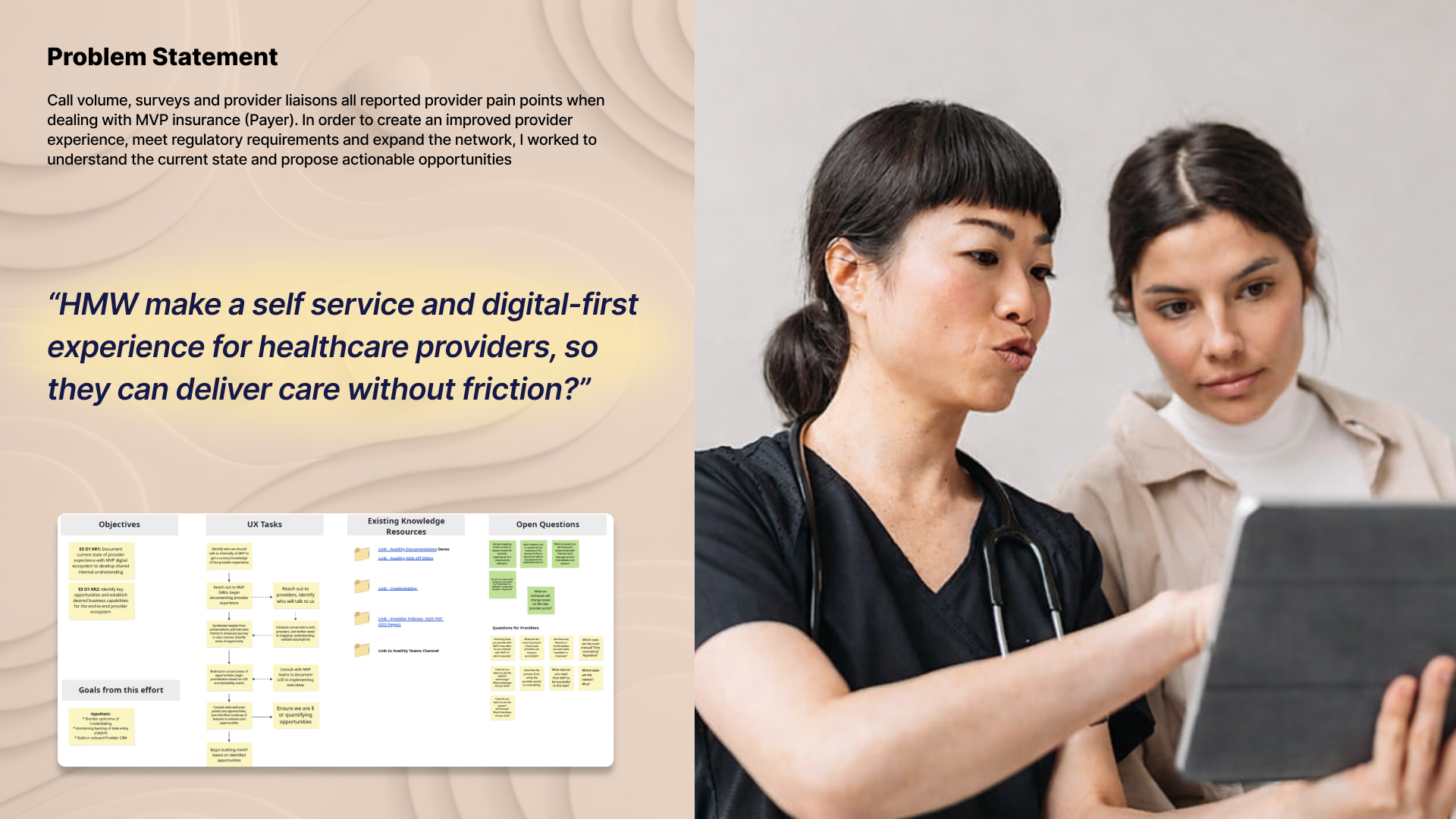 Established baseline journey and research through 20+ SME convos, 11 provider interviews and service blueprinting. Prioritized opportunities based on LOE and strategic value